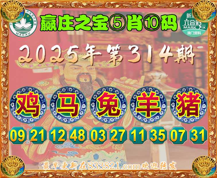 314期:【赢庄之宝】 ⚽⑤肖⑩码⚽【鸡马兔羊猪】开:羊23准
