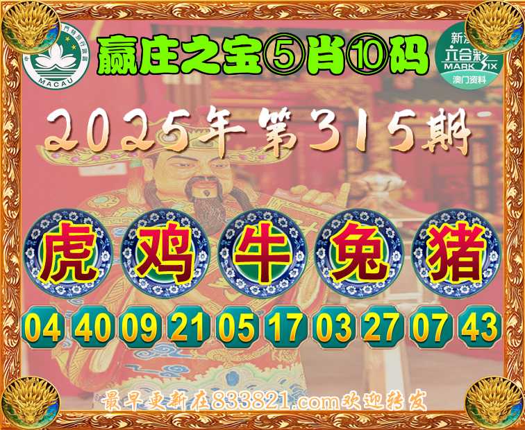 315期:【赢庄之宝】 ⚽⑤肖⑩码⚽【虎鸡牛兔猪】开:虎04准